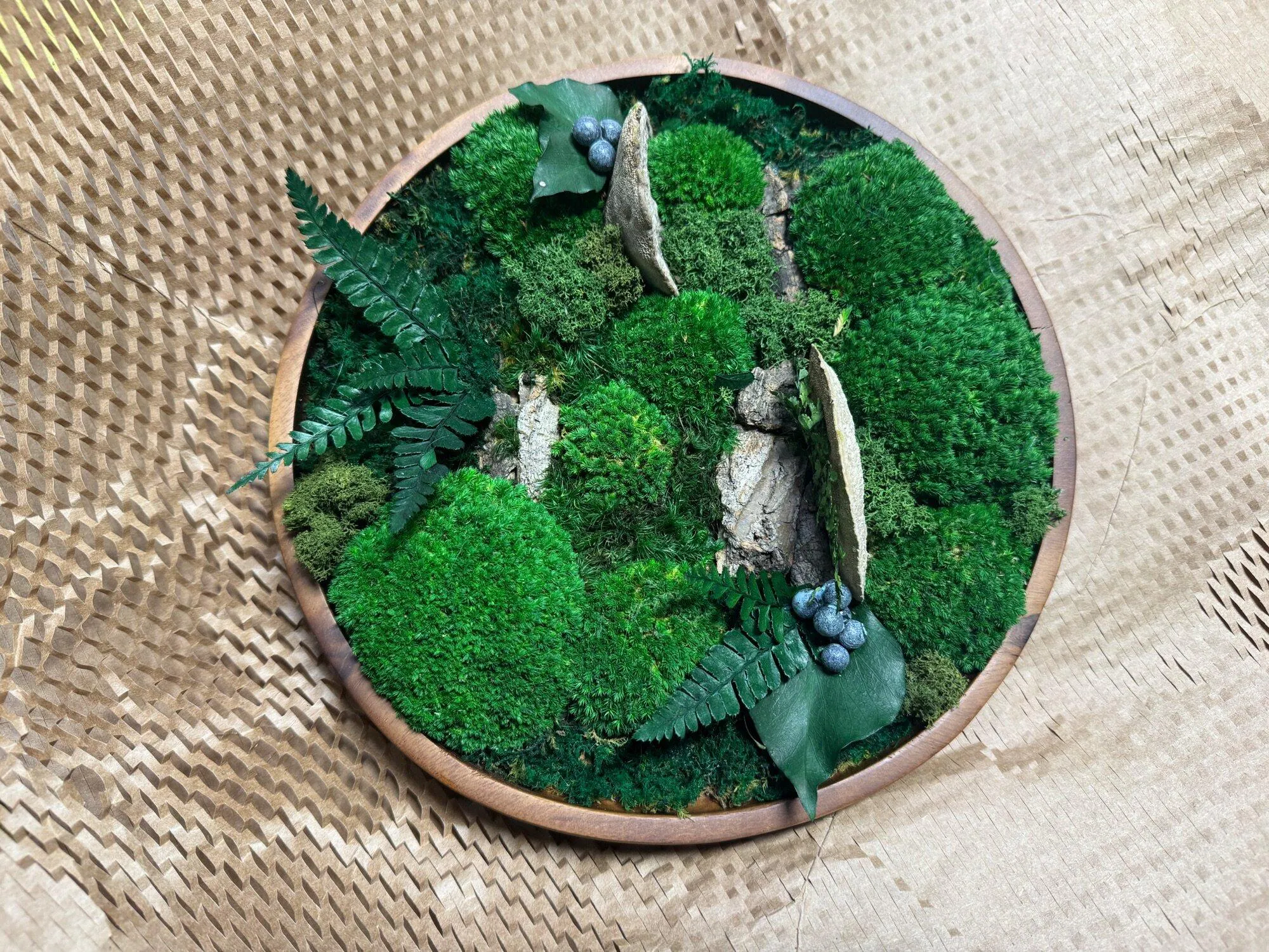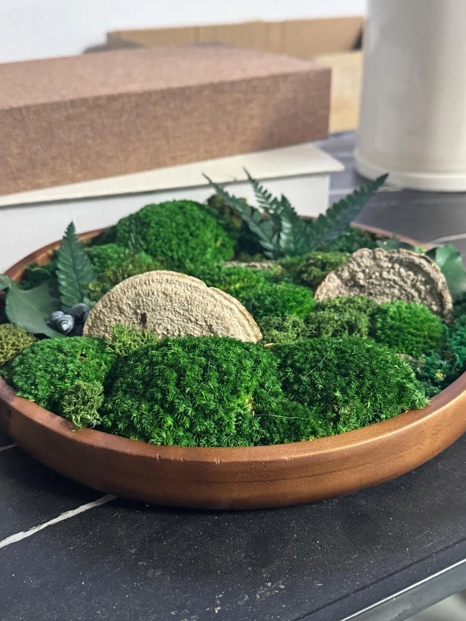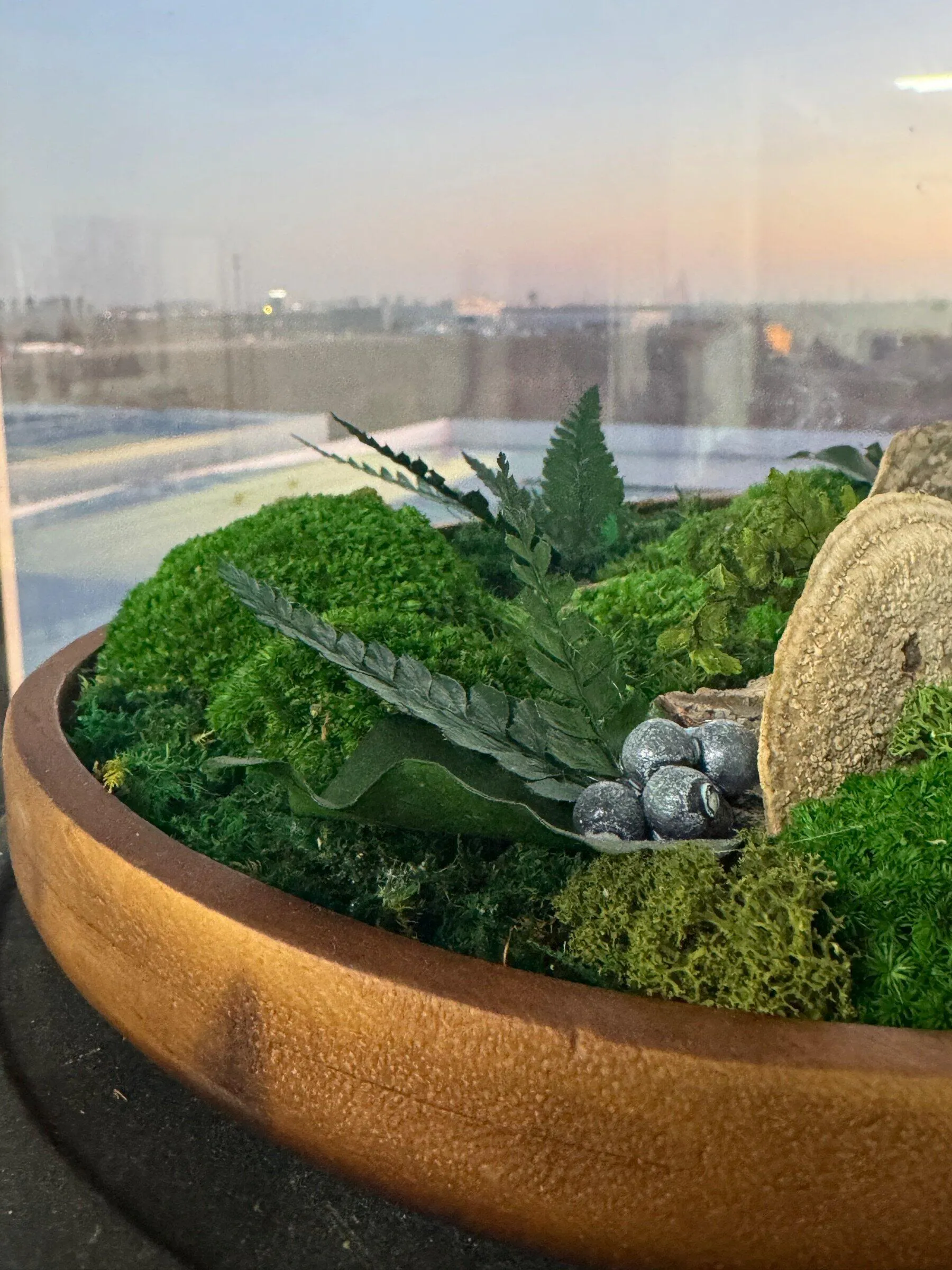 Artisanal walnut bowl with preserved moss and ferns—a minimalist touch of nature.
